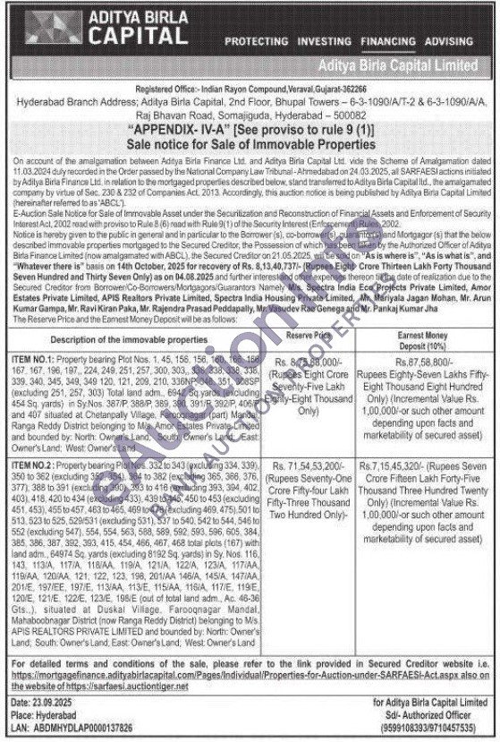 ITEM NO.1: Property bearing Plot Nos. 1. 45, 156, 156, 160, 166, 166 167, 167, 196, 197, 224, 249, 251, 257, 300, 303, 338, 338, 338, 338, 339. 340, 345, 349, 349 120, 121, 209, 210, 336NP, 348, 351. 308SP (excluding 251, 257, 303) Total land adm., 6942 Sq yards (excluding 454 Sq yards) in Sy.Nos. 387/P. 388/P, 389, 390, 391/P. 392/P, 406/P and 407 situated at Chetanpally Village, Farooqnagar (part) Mandal Ranga Reddy District belonging to Mis. Amor Estates Private Limited and bounded by: North. Owner's Land, South: Owner's Land, East Owner's Land: West: Owner's Land