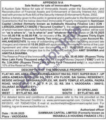 FLAT NO. 405, AREA ADMEASURING ABOUT 994 SQ. FEET, SUPER BUILT-UP AREA ADMEASURING 1590 SQ. FEET, 4TH FLOOR, SAI SAHAJ RESIDENCY, BESIDE AKSHAR DARSHAN DUPLEX, NR. BAPS TEMPLE ATLADRA, PADRA ROAD, VADODARA, T. P. 20, F. P. 21, 22, RS, 354 1, VADODARA 390012, GUJARAT. BOUNDED BY: