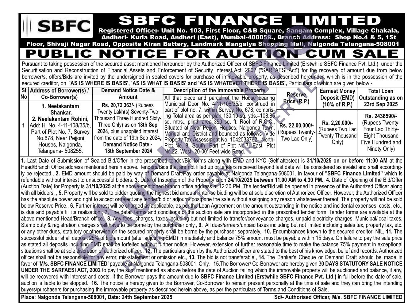 All that piece and parcel of the House bearing Municipal Door No. 4-11-108/35/b, construed in part of plot no. 7, within Survey No. 678, compris-ing Total area as per plan 130.19 sq. yds.=108.85 sq. mtrs., plinth area 390 sq. ft. Roof of R.C.C., Mandal and District and bounded as follows- Vide Situated at Near Pejjoni Houses, Nalgonda Town, Property Tax Assessment No. 1042033762. North-Plot No. 8, South Part of Plot No.7, East- Plot No.22, West-20-00' Feet wide Road