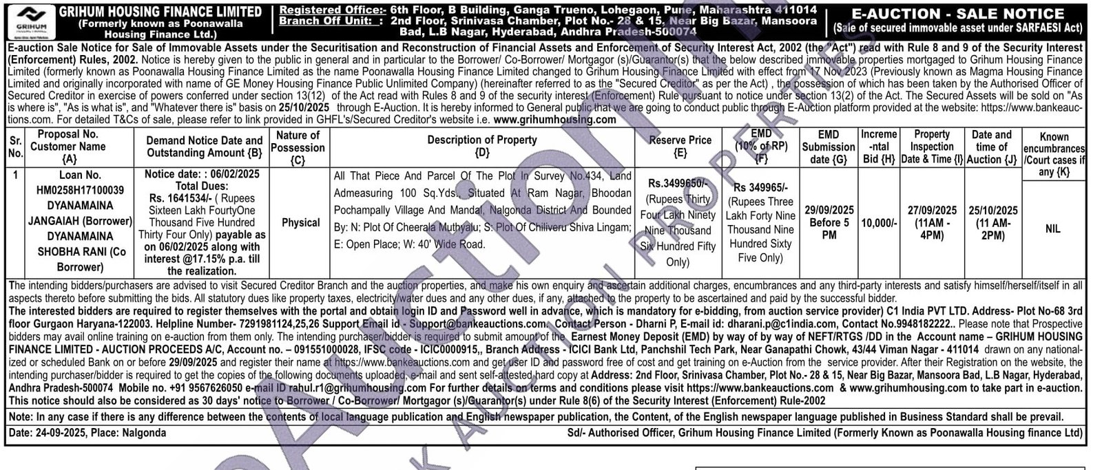 All That Piece And Parcel Of The Plot In Survey No.434, Land Admeasuring 100 Sq. Yds., Situated At Ram Nagar, Bhoodan Pochampally Village And Mandal. Nalgonda District And Bounded By: N: Plot Of Cheerala Muthyalu; S: Plot Of Chilliveru Shiva Lingam, E: Open Place: W: 40' Wide Road.