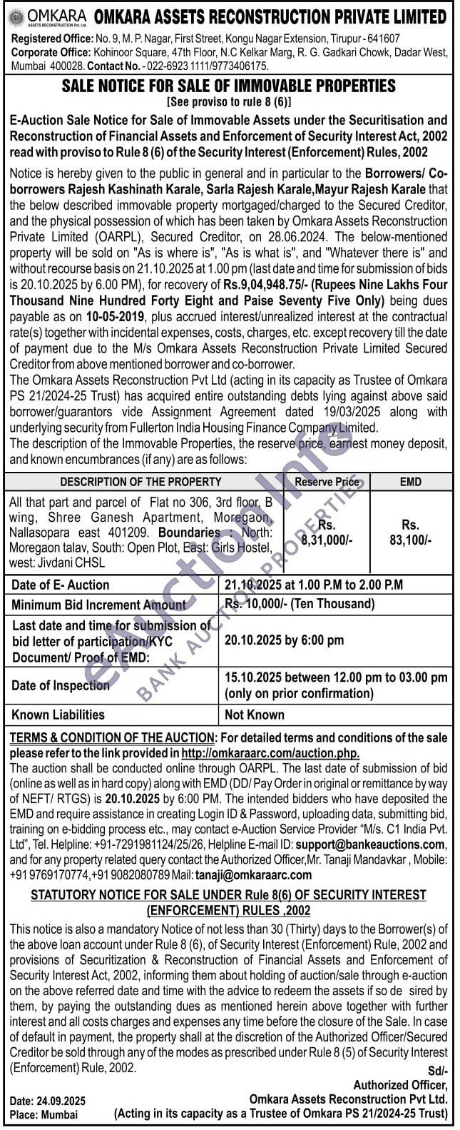 All that part and parcel of Flat no 306, 3rd floor, B wing, Shree Ganesh Apartment, Moregaon, Nallasopara east 401209. Boundaries: North: Moregaon talav, South: Open Plot, East: Girls Hostel, west: Jivdani CHSL