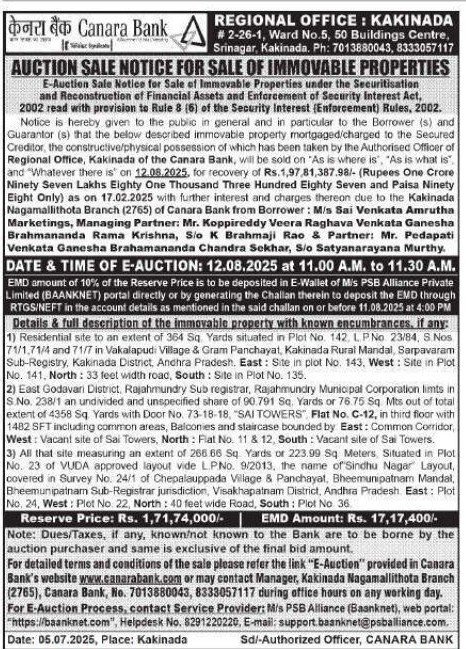 1) Residential site to an extent of 364 Sq Yards situated in Plot No. 142. LP No 23/84, S Nos 71/1,71/4 and 71/7 in Vakalapud: Village & Gram Panchayat, Kakinada Rural Mandal, Sarpavaram Sub-Registry, Kakinada District, Andhra Pradesh, East: Site in plot No. 143. West: Site in Plot No. 141, North: 33 feet width road, South: Site in Plot No. 135. 2) East Godavari District, Rajahmundry Sub registrar, Rajahmundry Municipal Corporation limts in S.No. 238/1 an undivided and unspecified share of 90.791 Sq. Yards or 76.75 Sq Mts out of total extent of 4358 Sq Yards with Door No. 73-18-18, "SAI TOWERS Flat No. C-12, in third floor with 1482 SFT including common areas, Balconies and staircase bounded by East: Common Corridor, West: Vacant site of Sai Towers, North: Flat No. 11 & 12, South: Vacant site of Sai Towers. 3) All that site measuring an extent of 266.66 Sq. Yards or 223.99 Sq Meters, Situated in Plot No. 23 of VUDA approved layout vide LPNo. 9/2013, the name of Sindhu Nagar Layout, covered in Survey No. 24/1 of Chepalauppada Village & Panchayat, Bheemunipatnam Mandal, Bheemunipatnam Sub-Registrar jurisdiction, Visakhapatnam District, Andhra Pradesh. East: Plot No. 24, West: Plot No. 22, North: 40 feet wide Road, South: Plot No 36.