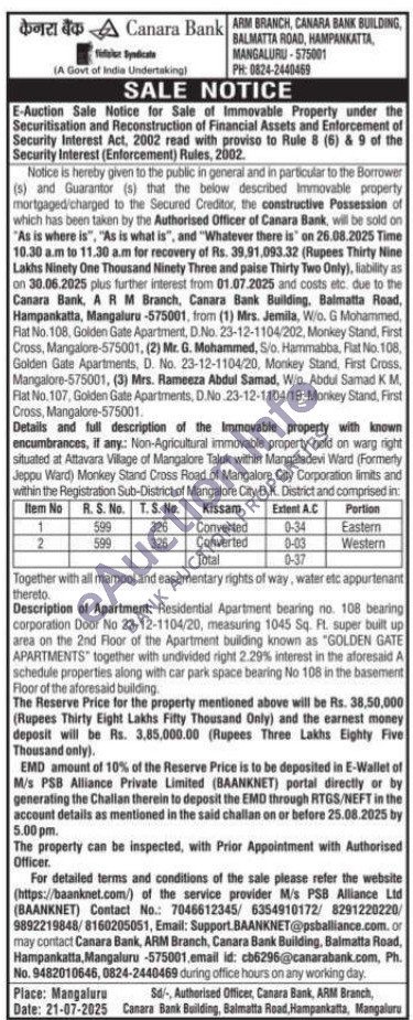 Description of Apartment: Residential Apartment bearing no. 108 bearing corporation Door No 23-12-1104/20, measuring 1045 Sq. Ft. super built up area on the 2nd Floor of the Apartment building known as "GOLDEN GATE APARTMENTS together with undivided right 2.29% interest in the aforesaid A schedule properties along with car park space bearing No 108 in the basement Floor of the aforesaid building.