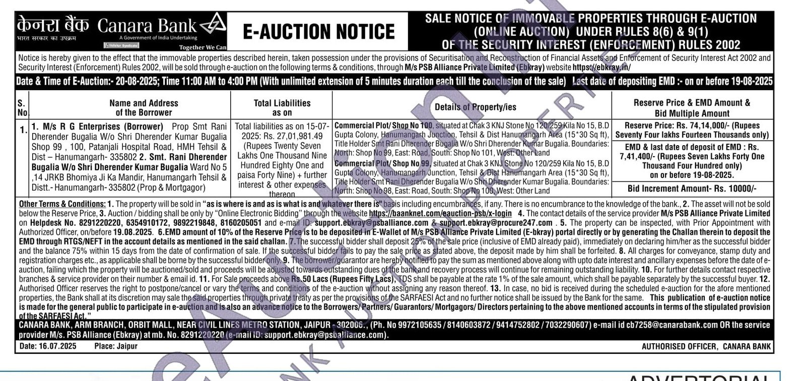 Commercial Plot/Shop No 100, situated at Chak 3 KNJ Stone No 120/259 Kila No 15, B.D Gupta Colony, Hanumangarh Junction, Tehsil & Dist Hanumangarh Area (15*30 Sq ft). Title Holder Smt Rani Dherender Bugalia W/o Shri Dherender Kumar Bugalia, Boundaries: