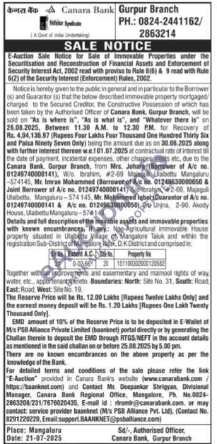 Details and fall description of the movable assets and immovable properties with known encumbrances, if any: Non-Agricultural immovable House property situated in Ulalbettu Village of Mangalore Taluk and within the registration Sub-District of Mangalore Taluk, D.K District and comprised in: