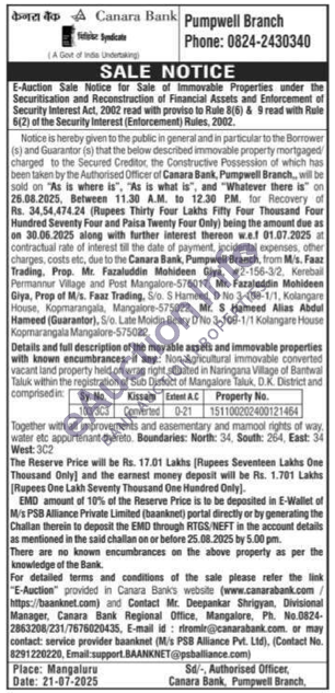 Details and fall description of the movable assets and immovable properties with known encumbrances, if any: Non-Agricultural immovable converted vacant land property held on wrag right situated in Naringana Village of Bantwal Taluk within the registration of Sub District of Mangalore Taluk, D.K. District and