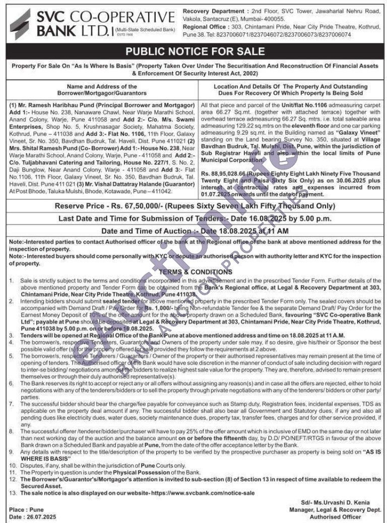 All that piece and parcel of the Unit/flat No.1106 admeasuring carpet area 66.27 Sq.mt. (together with attached terrace) together with overhead terrace admeasuring 66.27 Sq. mtrs, ie. total saleable area admeasuring 129.22 sq.mirs on the eleventh floor and one car parking admeasuring 9.29 sq.mt. in the Building named as "Galaxy Vineet" standing on the Land bearing Survey No. 350, situated at Village Bavdhan Budruk, Tal. Mulshi, Dist. Pune, within the jurisdiction of Sub Registrar Haveli and also within the local limits of Pune Municipal Corporation.