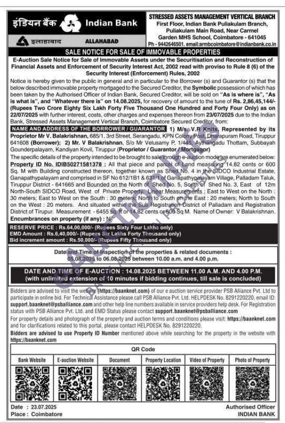 Sq. M with Building constructed thereon, together known as Shed No. 4 in the SIDCO Industrial Estate, Ganapathypalayam and comprised in SF No 612/1B1 & 631/1 of Ganapathypalayam Village, Palladam Taluk, Tiruppur District-641665 and Bounded on the North of Shed No. 5, South of Shed No. 3, East of 12m North-South SIDCO Road, West of Private Property. Linear Measurements; East to West on the North: 30 meters; East to West on the South: 30 meters; North to South on the East: 20 meters; North to South on the West: 20 meters. And situated within the Sub Registration District of Palladam and Registration District of Tirupur. Measurement-6455 sq. ft or 14.82 cents or 600 Sq M. Name of Owner: V Balakrishnan.