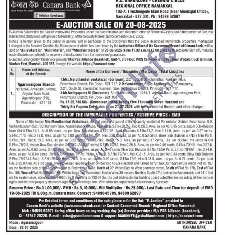 Name of Title holder Mrs. Maruthambal Venkatesan. All that piece and parcel of the property located at Perambalur District, Perambalur. R.D, Valikandapuram Sub.R.D, Kunnam Taluk, Agaramsigoor Village, Ayan nanja S.F.No. 71/1B, Hec.0.26.5, Ares, as per Ac.0.65 cents, as per Sub-division from Old S.F.No.71/1, Ac.0.65 cents, as per New Sub-division S.F.71/1B, Ac. 0.65 cents S.F.No. 71/2, Hec.0.11.0, Ares, as per Ac.0.27 cents, S.F.No.71/3, Hec.0.73.0, Ares, as per Ac.1.80 cents, S.F.No. 71/4, Hec.0.20.0, Ares, as per Ac.0.50 cents, (New Sub Division S.F.No. 71/4A Part). S.F.No. 79/1, Hec.0.13.0. Ares, as per Ac.0.32 cents, S.F.No. 79/2, Hec.0.15.0, Ares, as per Ac.0.37 cents, (As per clubbed the lands in Old S.F.No. 79/2,3, As per New Sub-division S.F.79/2, Ac.0.37 cents) S.F.No. 79/4A, Hec.0.26.5, Ares, as per Ac.0.66 cents, S.F.No.79/4B, Hec.0.37.5, Ares, as per Ac.0.93 cents, S.FNo.79/5, Hec.0.18.5, Ares, as per Ac.0.46 cents (New Sub Division S.F.No. 79/5A Part), S.F.No. 79/6A1, Hec.0.34.0, Ares, as per Ac.0.84 cents (New Sub Division S.F.No.79/6A1A Part), S.F.No. 79/7A1, Hec.0.21.5, Ares, as per Ac.0.53 cents (New Sub Division S.F.No. 79/7A1A Part), S.F.No. 79/8A, Hec.0.20.0, Ares, as per Ac.0.49 cents, S.F.No.79/9, Hec.0.08.5, Ares, as per Ac.0.21 cents, As per total Hec 3.25.0 Ares, Ac 8.03 cents, The above said land have been divided into house site plots and named as "Sri Gokulam Garden", in which Plot No. 157 on the Northern side of the Agaramsigoor to Perambalur Road. North of 20' Widen East to West common street, South of Plot No.178, East of Plot No. 158, West of Plot No. 155 and 156. Within these four boundaries East to West 30 feet and North to South 47% feet on the Eastern side and 46% feet on the western side, admeasuring 1406% Sq.ft equalling to 130.64 Sq.mts plot and residential building constructed thereon including all the mamool rights and this said proper ty situated in Agaramsigoor village limit. With all the usual pathway & easementary rights etc