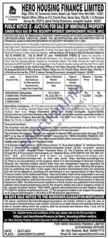 Description of property: All That piece and parcel of Residential Plot Bearing No. 7/P (Type B-1) of RSN 129/1P, Jai Mataji. Swastik Nagar, Near Khodiyar Dairy, Behind Nandanvan City Bus Stop. Off Khalilpur Main road. Village Khamdhrol Tehsil and District Junagadh, Gujarat-362002. Construction on Land Area Admeasuring 35-65 Sq. Mtr, along with common amenities written in Title Document. Property Bounded By: North: Ad 6 Mtr Wide Road. East: Adj Plot No. 7P B2. West: Ad. Plot No. 2. South: An Plot No Alt