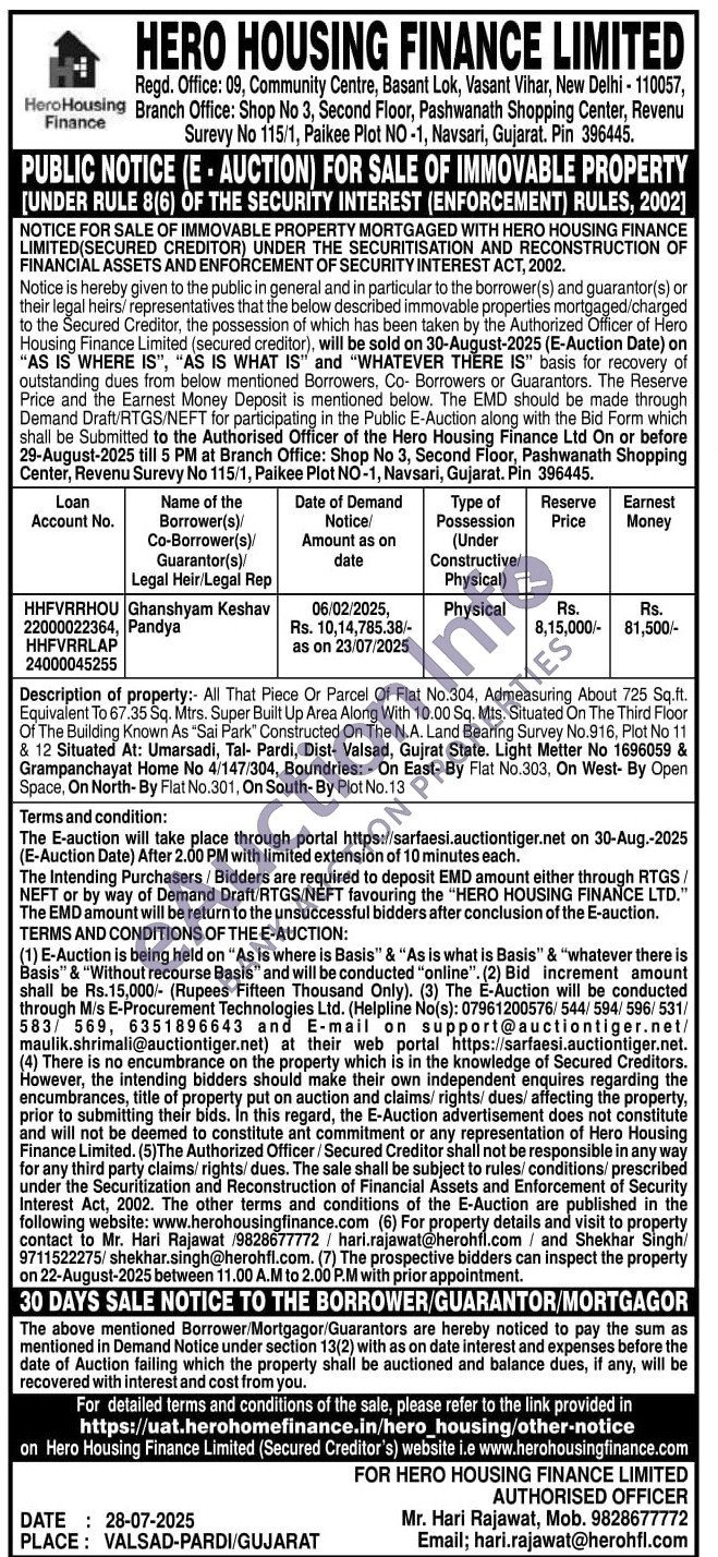All That Piece Or Parcel Of Flat No.304, Admeasuring About 725 Sq.ft. Equivalent To 67.35 Sq. Mtrs. Super Built Up Area Along With 10.00 Sq. Mts. Situated On The Third Floor Of The Building Known As "Sai Park" Constructed On The N.A. Land Bearing Survey No.916, Plot No 11 & 12 Situated At: Umarsadi, Tal- Pardi, Dist- Valsad, Gujrat State. Light Metter No 1696059 & Grampanchayat Home No 4/147/304, Boundries: - On East- By Flat No.303, On West- By Open Space, On North-By Flat No.301, On South-By Plot No.13