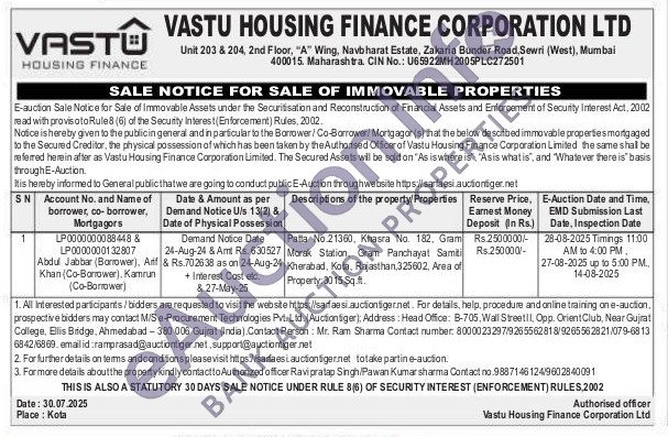 Patta No. 21360, Khasra No. 182, Gram Morak Station, Gram Panchayat Samiti Kherabad, Kota, Rajasthan,325602, Area of Property: 30 15 Sq.ft.