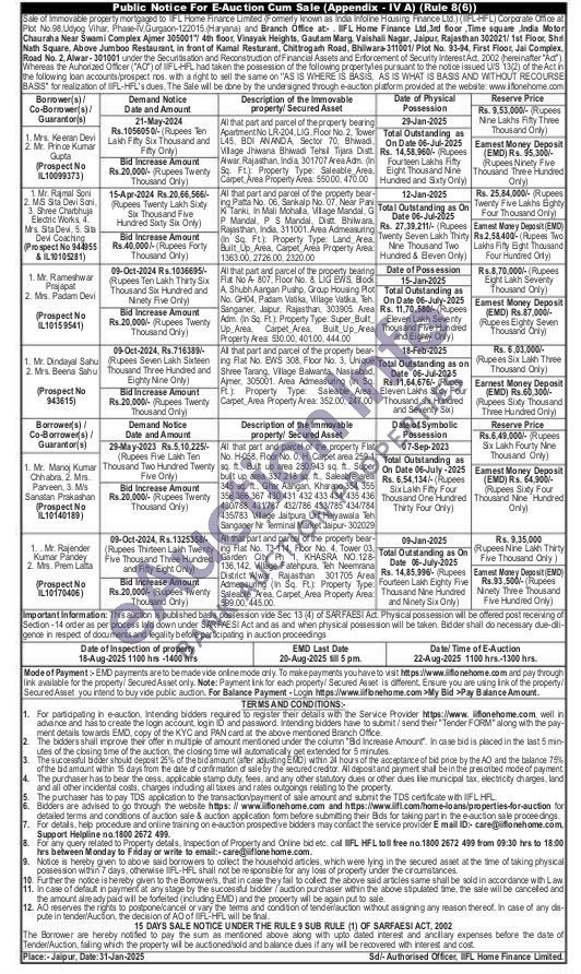 All that part and parcel of the property bear-ing Flat No. EWS 308, Floor No. 3, Unique Shree Tarang, Village Balwanta, Nasirabad, Ajmer, 305001. Area Admeasuring (In Sq. PL): Property Type: Saleable Area, Carpet Area Property Area: 352.00, 247.00