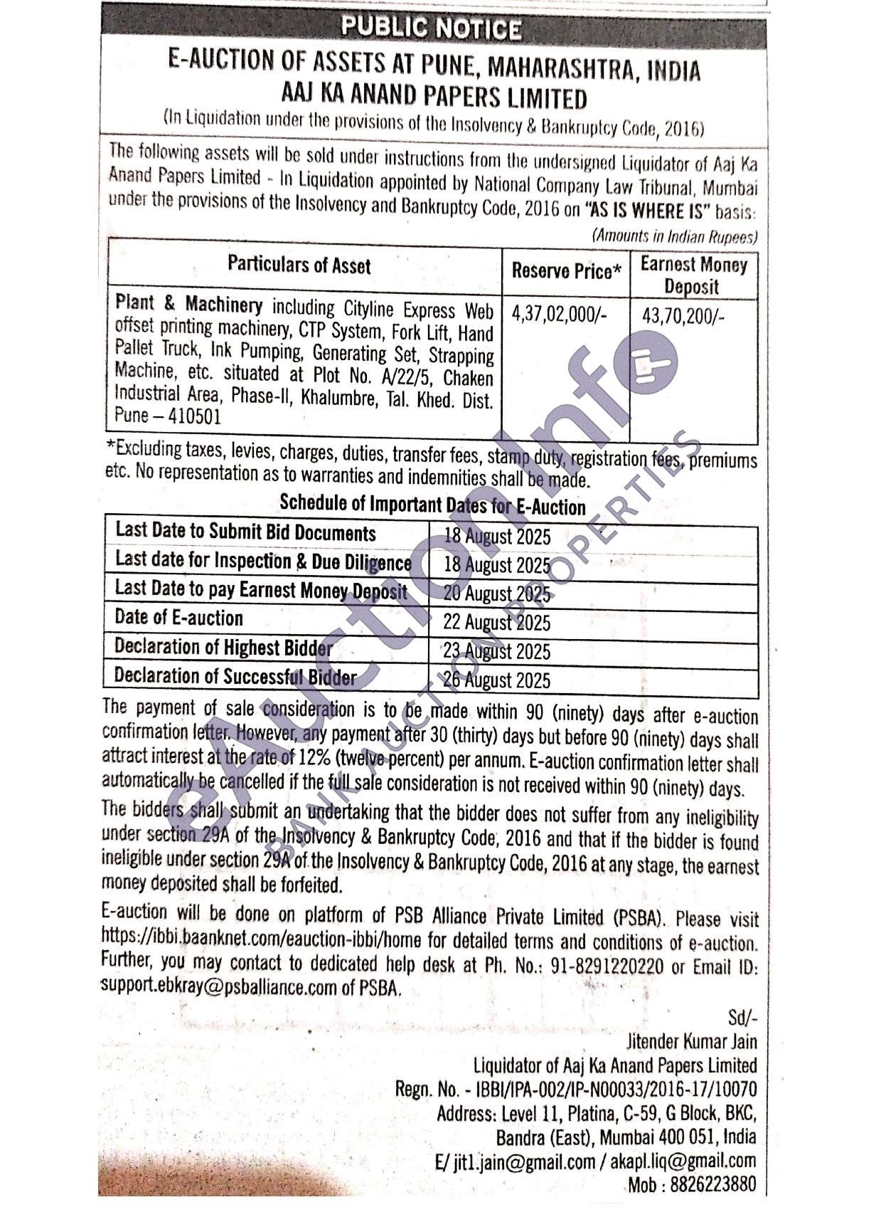 Plant & Machinery including Cityline Express Web offset printing machinery, CTP System, Fork Lift, Hand Pallet Truck, Ink Pumping, Generating Set, Strapping Machine, etc. situated at Plot No. A/22/5, Chaken Industrial Area, Phase-II, Khalumbre, Tal. Khed. Dist. Pune-410501