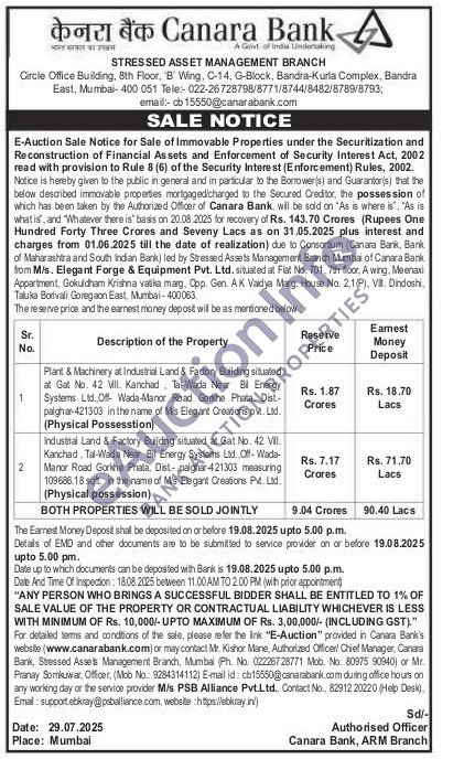 Plant & Machinery at Industrial Land & Fadory Building situated at Gat No. 42 VII. Kanchad Tal-Wada Near Bil Energy Systems Ltd. Of Wada-Manor Road Gorkhe Phata, Dist-palghar-421303 in the name of Mis Elegant Creations pvt. Ltd. (Physical Possesstion)