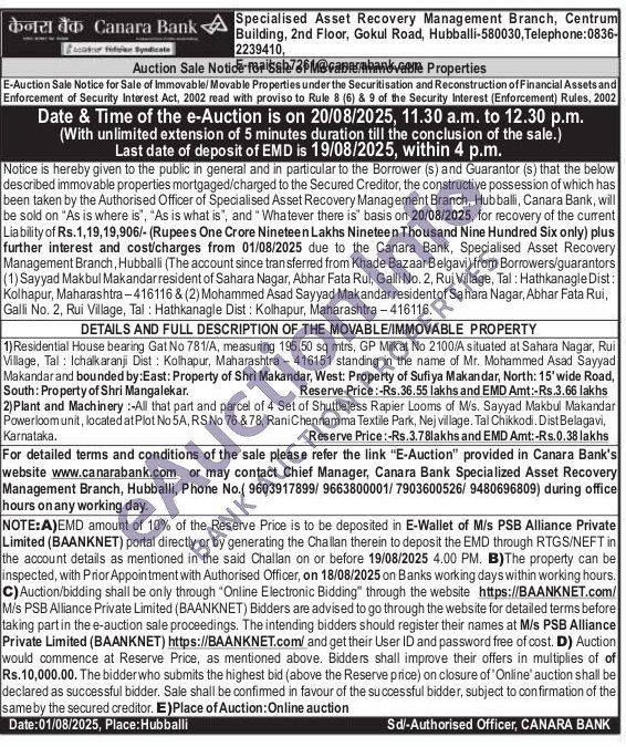 Plant and Machinery: All that part and parcel of 4 Set of Shuttleless Rapier Looms of M/s. Sayyad Makbul Makandar Powerloom unit, located at Plot No 5A, RS No 76 & 78, Rani Chennamma Textile Park, Nej village. Tal Chikkodi. Dist Belagavi, Karnataka.