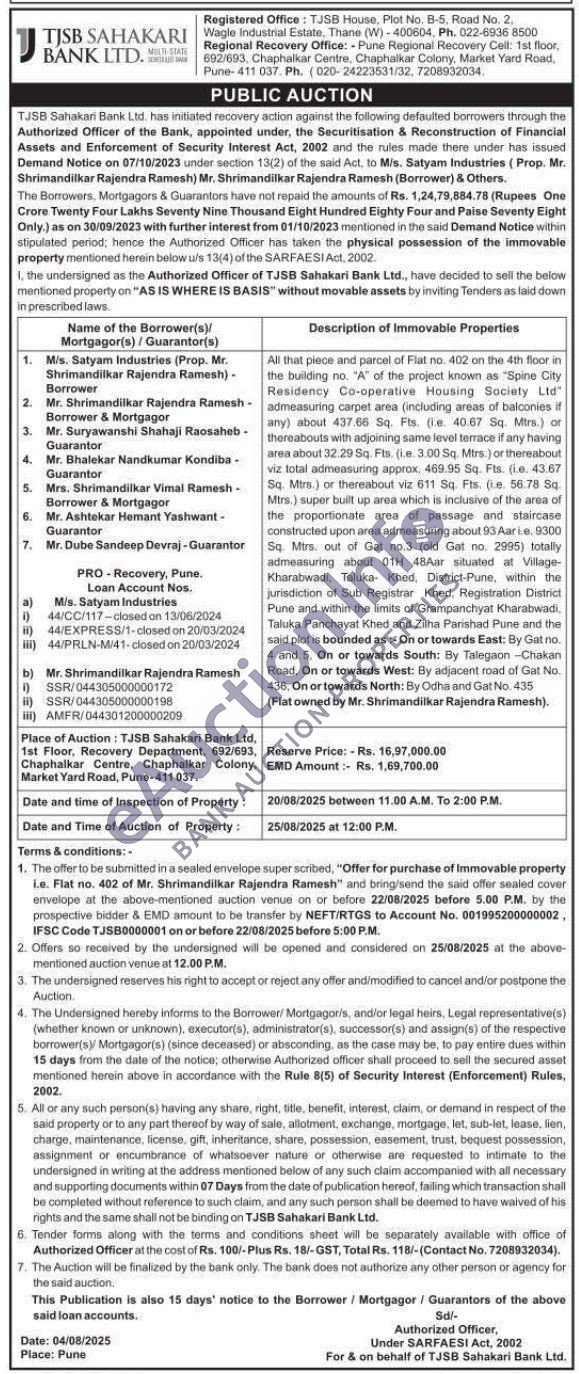 All that piece and parcel of Flat no. 402 on the 4th floor in the building no. "A" of the project known as "Spine City Residency Co-operative Housing Society Ltd admeasuring carpet area (including areas of balconies if any) about 437.66 Sq. Fts. (ie 40.67 Sq. Mtrs.) or thereabouts with adjoining same level terrace if any having area about 32.29 5Sq. Fts (le 3.00 Sq. Mtrs.) or thereabout viz total admeasuring approx. 469.95 Sq. Fts. (ie. 43.67 Sq. Mts) or thereabout viz 611 Sq. Fts. (ie. 56.78 Sq. Mirs) super built up area which is inclusive of the area of the proportionate area of passage and staircase constructed upon area admeasuring about 93 Aar ie. 9300 Sq. Mirs out of Gat no.3 (old Gat no. 2995) totally admeasuring about 01H 48Aar situated at Village-Kharabwadi, Taluka Khed District-Pune, within the jurisdiction of Sub Registrar Khed, Registration District Pune and within the limits of Grampanchyat Kharabwadi, Taluka Panchayat Khed and Zilha Parishad Pune and the said plot is bounded as:-On or towards East: By Gat no. 4 and 5. On or towards South: By Talegaon -Chakan Road, On or towards West: By adjacent road of Gat No. 436. On or towards North: By Odha and Gat No 435 (Flat owned by Mr. Shrimandilkar Rajendra Ramesh).
