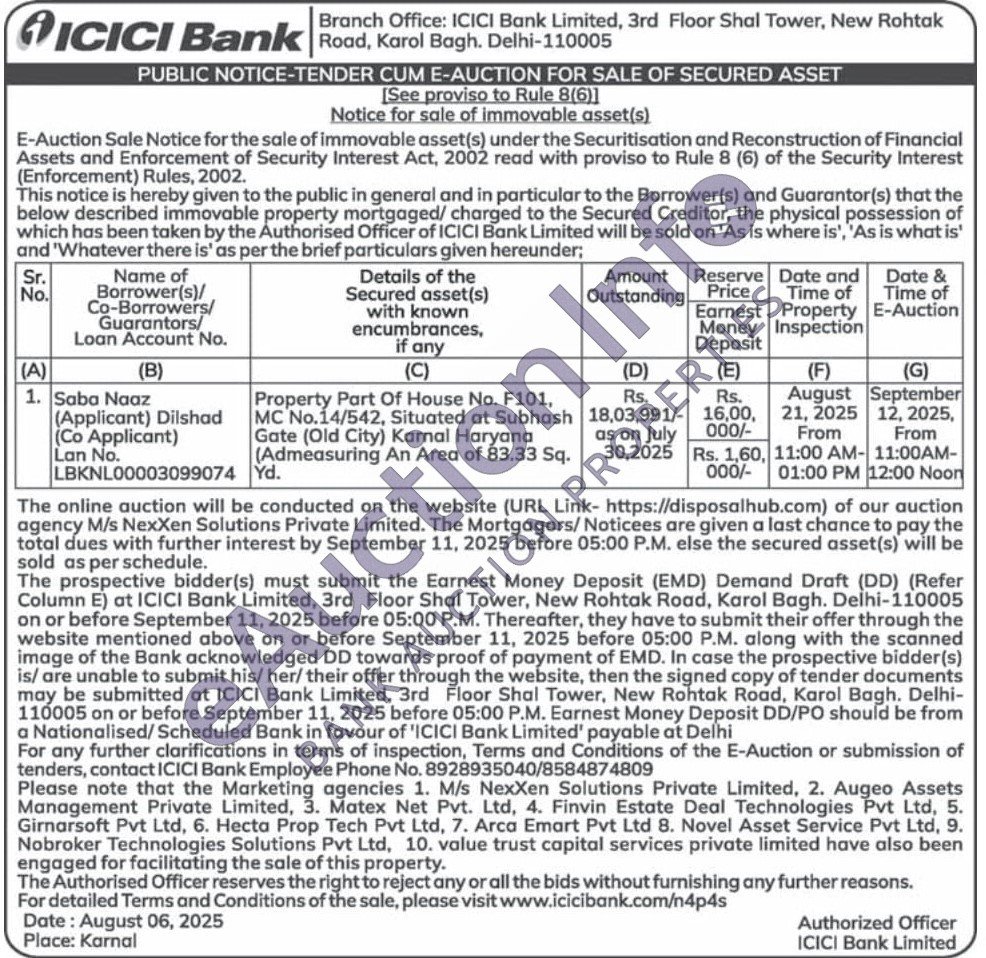 Property Part Of House No. F101, MC No.14/542, Situated at Subhash Gate (Old City) Karnal Haryana (Admeasuring An Area of 83.33 Sq. Yd