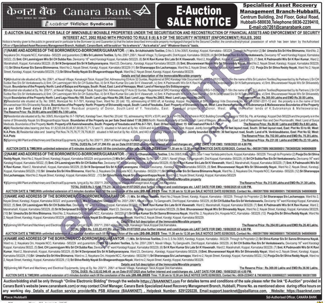 1)Spinning Mill Plant and Machinery and Electrical Equipments, lying at Sy. No: 200//1, 206/1 at Navali Village, Kanakagiri taluk, Koppal Dist Karnataka