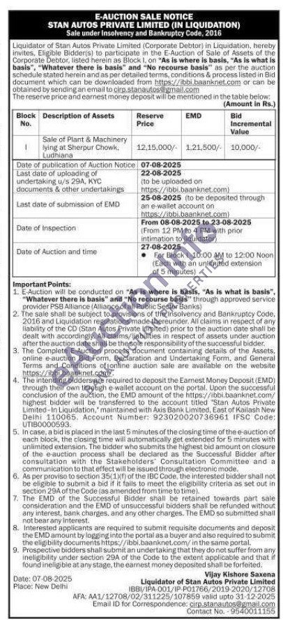 Sale of Plant & Machinery lying at Sherpur Chowk, Ludhiana