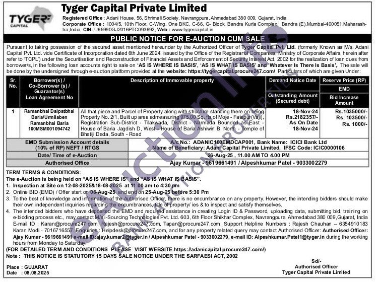 All that piece and Parcel of Property along with structure standing there on being Property No. 2/1, Built up area admeasuring 975.00 Sq. fts of Moje - Fatepur (Vaji), Registration Sub-District Tilakwada, District Narmada Bounded as East -House of Baria Jagdish D. West House of Baria Ashiwin B, North Temple of Bhatiji Dada, South - Road