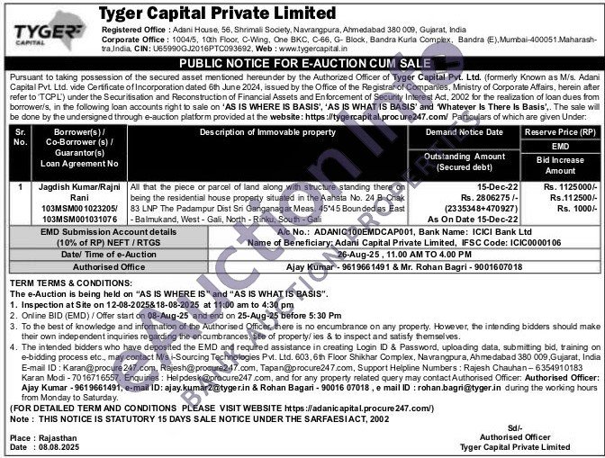 All that the piece or parcel of land along with structure standing there on being the residential house property situated in the Aahata No. 24 B Chak 83 LNP The Padampur Dist Sri Ganganagar Meas. 45*45 Bounded as East -Balmukand, West-Gali, North-Rinku, South-Gali