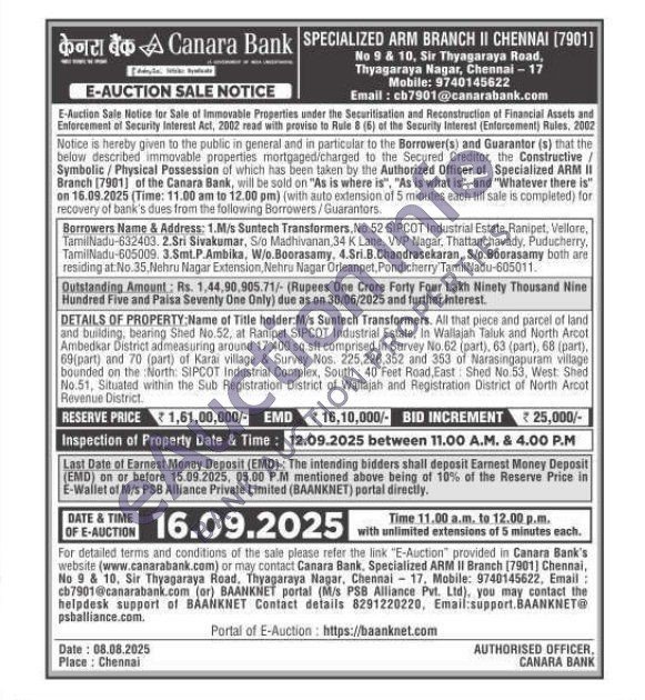 DETAILS OF PROPERTY Name of Title holder:M/s Suntech Transformers. All that piece and parcel of land and building, bearing Shed No.52, at Ranipet SIPCOT Industrial Estate, In Wallajah Taluk and North Arcot Ambedkar District admeasuring around 17,400 sq sft comprised in Survey No. 62 (part), 63 (part), 68 (part). 69(part) and 70 (part) of Karai village & Survey Nos. 225,226,352 and 353 of Narasingapuram village bounded on the North: SIPCOT Industrial Complex, South: 40 Feet Road, East Shed No 53, West Shed No.51, Situated within the Sub Registration District of Wallajah and Registration District of North Arcot Revenue District.
