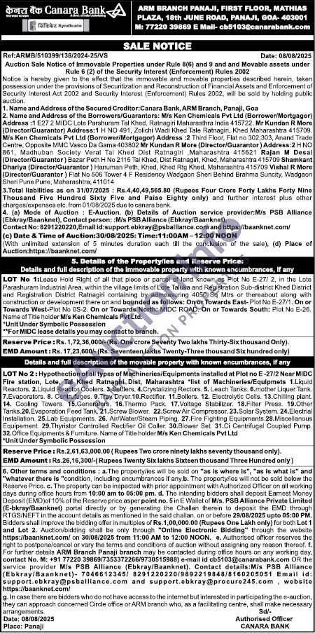 LOT No 2: Hypothection of all types of Machineries/Equipments installed at Plot no E-27/2 Near MIDC Fire station, Lote, Tal Khed Ratnagiri Dist, Maharashtra "list of Machineries/Equipmets 1. Liquid Reactors, 2.Liquid Reactor Coolers. 3.Settlers. 4. Crystalizing Rectors. 5. Leach Tanks. 6.mother Liquer Tank. 7.Evaporators. 8. Centrufuges. 9. Tray Dryer 10.Rectifier. 11.Boilers. 12. Electrolytic Cells. 13.Chilling plant. 14. Cooling Towers 15. Generators. 16. Thermo Pack. 17.Voltage Stabilizer. 18. Filter Press. 19.Other Tanks.20. Evaporation Feed Tank. 21. Screw Blower. 22. Screw Air Compressor. 23. Solar System. 24. Electrial Installation. 25.Lab Equipments. 26. Air/Water/Steam Piping. 27.Fire Fighting Equipments 28. Miscellanous Equipement. 29. Thyristor Controlled Rectifier Oil Coller 30.Blower Set. 31. Ci Centrifugal Coupled Pump 32.Office Equipments & Furniture. Name of Title holder Mis Ken Chemicals Pvt Ltd "Unit Under Symbolic Possession