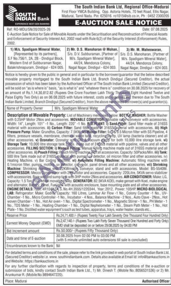 List of Machinery mentioned below: BOTTLE WASHER: Bottle Washer with 0.25HP Motor 2Nos and accessories. MOVABLE CONVEYOR: Movable roller conveyor with accessories. Width: 14", Length: 101-1 No., Length: 220-1 No. R.O.PLANT: i) Sand Filter: Sand filter made of 316SS material with accessories. ii) Carbon Filter: Sand filter made of 316SS material with accessories. iii) High Pressure Pump: Make: Grundfos, Capacity: 7.5KW, Iv) Micron Filter: 5, 1 & 0.5 Micron filter with SS Pipeline, 4 filters, pressure vessels, membrane, chemical waste tank, recycling pump, UV lamp (bacteria cleaner) and all other accessories. v) Ozonator: Ozonator with CRI & Vacuum pump for both 10.000 litre storage tank. vi) Storage Tank: 10.000 litre storage tank 2 Nos. made out of 316 SS material with pipeline, valves and all other accessories. FILLING SECTION: i) Manual Filling: Manual Filling machine made out of 316SS material and all other accessories. ii) Pouch Filling: Pouch filling machine with all accessories. Capacity: 50Packs/Min. iii) Tank: 500 litre Tank made out of 316SS material with pumps, uv detector, oil micron filter and other accessories, iv) Heating Machine. v) Bar Coding Machine vi) Automatic Filling Machine: Automatic filling machine with 0.1micron filter, pumps, motors, uv detector, conveyor, panel drives and all other accessories. vii) Shrinking Machine: Shrinking machine with 22KWmotor, conveyor, stand and with accessories. Model: BS-5540M COMPRESSOR: Mecco Compressor with 2HP motor and accessories. Capacity: 220Litre, 5KVA servo stabilizer with accessories. Bore well and sump tank with 3HP motor 2Nos and accessories. AIR CONDITIONER: Make: LG Capacity: 1.5 Ton, Four wheel movable trolley, GENERATOR: 82.5KVA KOEL make genset with Koel, make engine and alternator, Battery, Panel, Fuel tank with acoustic enclosure, base mounting plate and all other accessories. ENGINE DETAILS: Type: 4R1040 TA, S. No.4H.3555/1220344, Year: 2012, Power: 105HP MICRO-BIOLOGICAL LAB: Refrigerator: Make: Godrej, Capacity: 160 Litres, Laminar Air Flow -1 No. Colony Counter -1 No., UV-Chamber-1 No., Micro Controller -1 No., Incubator-4 Nos., Balance Machine-2 Nos, Auto Clave-2Nos Hot woven Chamber-1 No., Hot Air oven-1 No., Digital Spectrometer-1 No., Magnetic Stirrer-1 No.. PH Meter-1 No., TDS Meter-1 No., Heating Chamber-1 No., Digital Nephelometer-1 No., Steam Path Meter-1 No., Hot Plate-1 No. Distilled water equipment's such as test tubes, apparatus, trays, water heater, stands etc..