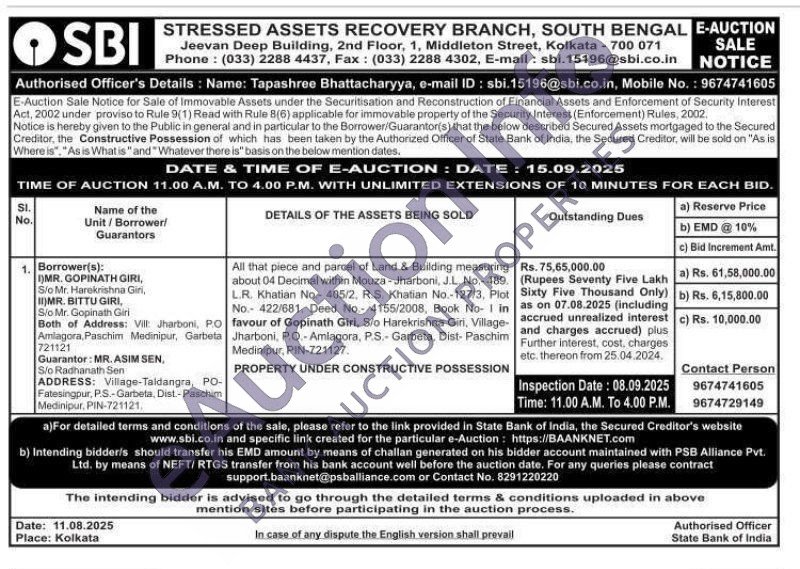 All that piece and parcel of Land & Building measuring about 04 Decimal within Mouza - Jharboni, J.L. No.-489. L.R. Khatian No.- 405/2, R.S. Khatian No.-127/3, Plot No.- 422/681. Deed No. 4155/2008, Book No-I in favour of Gopinath Giri, S/o Harekrishna Giri, Village Jharboni, P.O.-Amlagora, P.S.- Garbeta, Dist- Paschim Medinipur, PIN-721127.