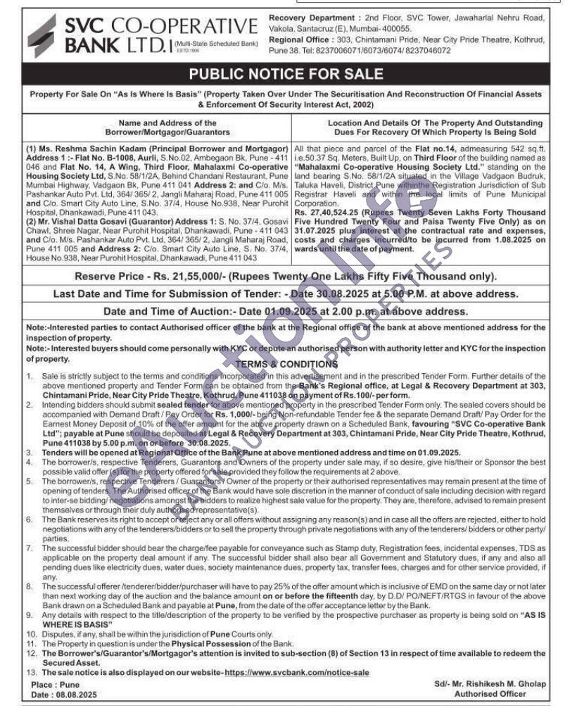 All that piece and parcel of the Flat no.14, admeasuring 542 sq.ft. ie.50.37 Sq. Meters, Built Up, on Third Floor of the building named as "Mahalaxmi Co-operative Housing Society Ltd." standing on the land bearing S.No. 58/1/2A situated in the Village Vadgaon Budruk, Taluka Haveli, District Pune withinthe Registration Jurisdiction of Sub Registrar Haveli and within the local limits of Pune Municipal Corporation,