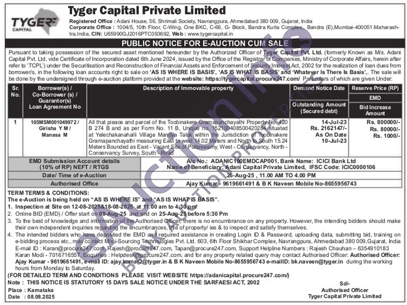 All that pieace and parcel of the Toobinakere Gramapanchayathi Property No. 420 B 274 B and as per Form No. 11 B. Unique no. 152100408500420284 situated at Yelechakanahalli Village Mandya Taluk within the Jurisdiction of Toobinakere Gramapanchayathi measuring East to west 14.02 Meters and North to South 15.24 Meters Bounded as East - Vacant Site of Puttaswamy, West-Conservancy, North-Conservancy Survey, South - Road