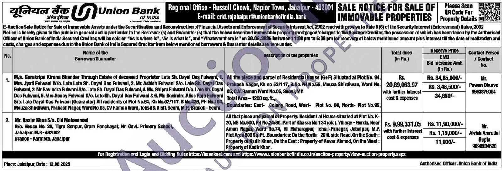 All the piece and parcel of Residential house (G+F) Situated at Plot No. 94, Prakash Nagar, Kh no 52/117, B.No.PH No.56, Mouza Shirdiwan, Ward No. 05, C.V. Raman Ward No.05, Seoni, MP.