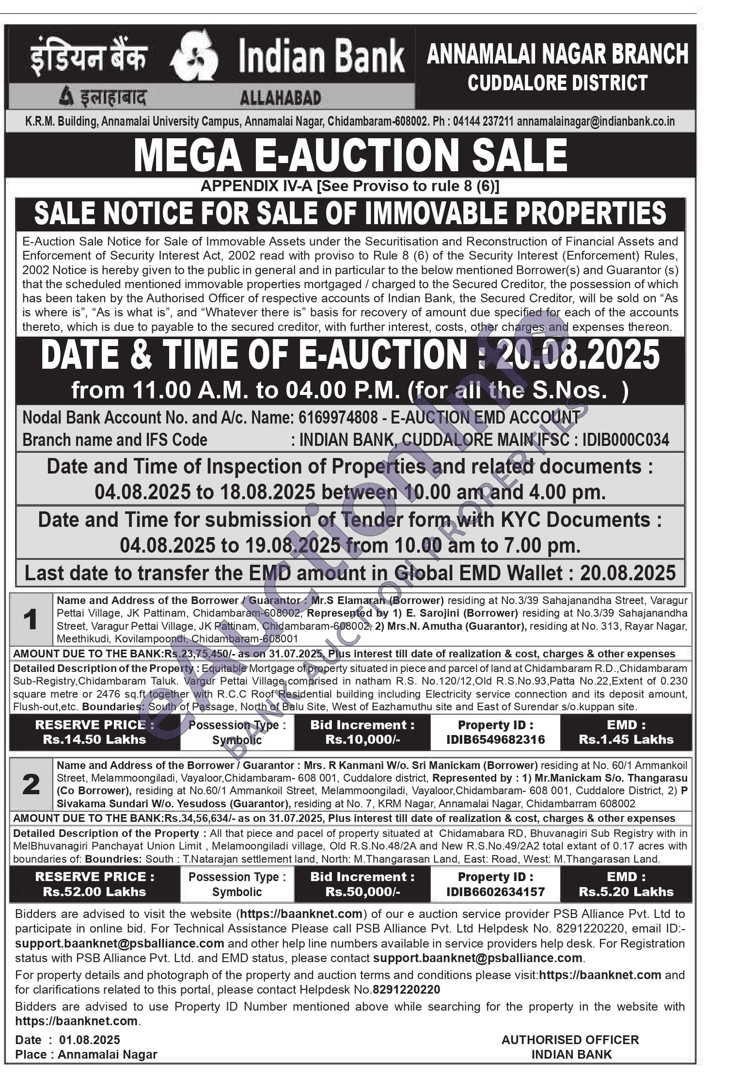 Detailed Description of the Property: Equitable Mortgage of property situated in piece and parcel of land at Chidambaram R.D., Chidambaram Sub-Registry, Chidambaram Taluk. Vargur Pettai Village, comprised in natham R.S. No.120/12,Old R.S.No.93, Patta No.22, Extent of 0.230 square metre or 2476 sq.ft together with R.C.C Roof Residential building including Electricity service connection and its deposit amount, Flush-out,etc. Boundaries: South of Passage, North of Balu Site, West of Eazhamuthu site and East of Surendar s/o kuppan site.