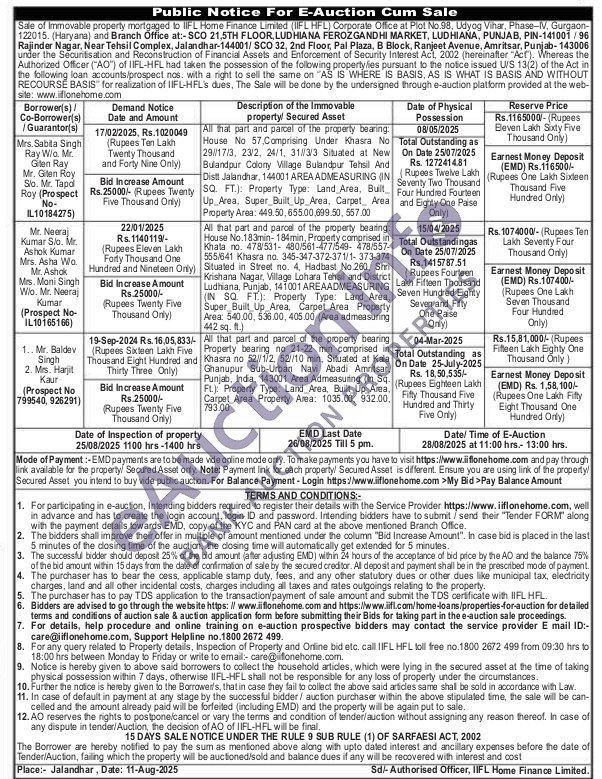 All that part and parcel of the property bearing: House No. 183min-184min, Property comprised in Khala no. 478/531-480/561-477/549-478/557-555/641 Khasra по. 345-347-372-371/1-373-374 Situated in Street no. 4, Hadbast No.260, Shri Krishana Nagar, Village Lohara Tehsil and District Ludhiana, Punjab, 141001 AREAADMEASURING (IN SQ. FT.): Property Type: Land Area, Super Built Up Area Carpet Area Property Area: 540.00.536.00, 405.00 (Area admeasuring 442 sq. ft.)