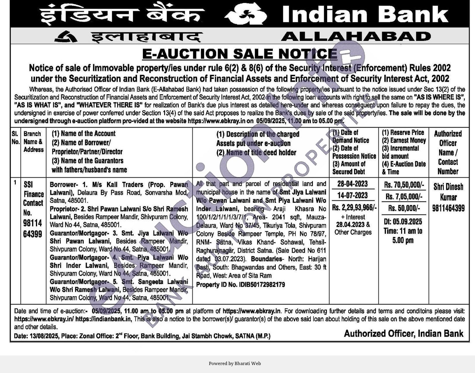 Inder Lalwani, bearing Araji Khasra No 100/1/2/1/1/1/3/7/1, Area- 2041 sqft, Mauza-Delaura, Ward No 37/45, Tikuriya Tola, Shivpuram Colony Beside Rampeer Temple, PH No 78/97, RNM- Satna, Vikas Khand- Sohawal, Tehsil-Raghurajnagar, District Satna. (Sale Deed No 611 dated 03.07.2023). Boundaries- North: Harijan Basti, South: Bhagwandas and Others, East: 30 ft Road, West: Area of Sita Ram