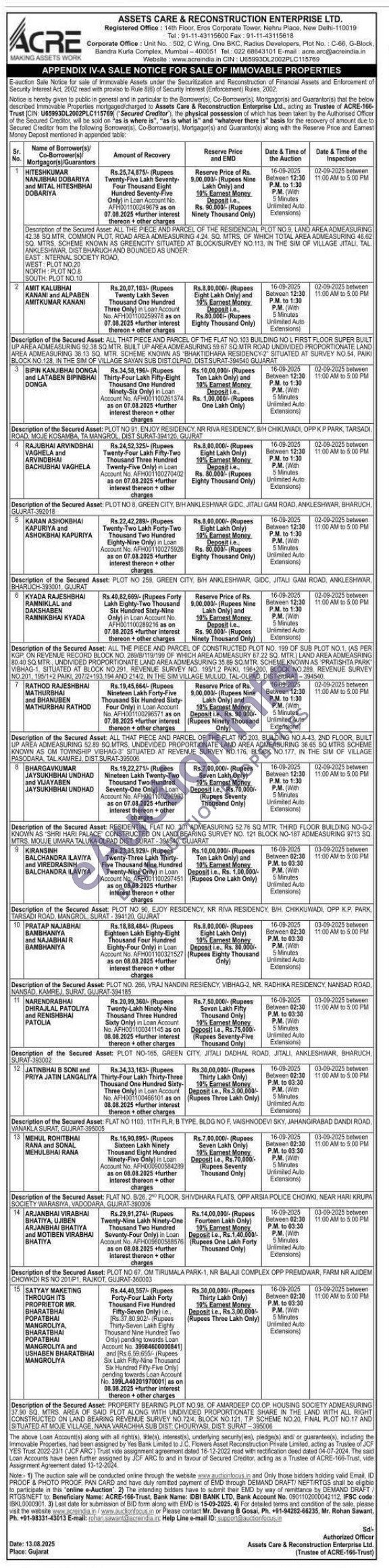 Description of the Secured Asset: ALL THE PIECE AND PARCEL OF THE RESIDENCIAL PLOT NO.9, LAND AREA ADMEASURING 42.38 SQ.MTR, COMMON PLOT, ROAD AREA ADMEASURING 4.24. SQ. MTRS, OF WHICH TOTAL AREA ADMEASURING 46.62 SO MTRS, SCHEME KNOWN AS GREENCITY SITUATED AT BLOCK/SURVEY NO.113, IN THE SIM OF VILLAGE JITALI, TAL ANKLESHWAR, DIST BHARUCH AND BOUNDED AS UNDER: