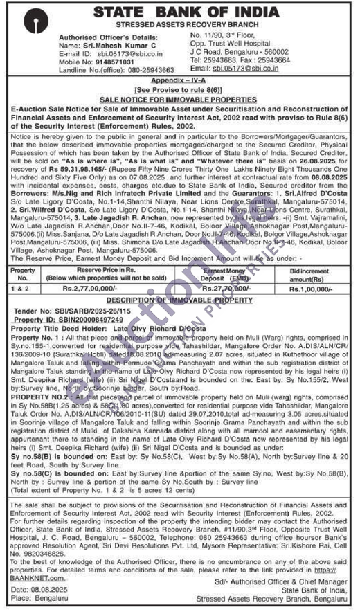 Property Title Deed Holder: Late Olvy Richard D'Costa Property No. 1: All that piece and parcel of immovable property held on Muli (Warg) rights, comprised in Sy.no.155-1,converted for residential purpose vide Tahashildar, Mangalore Order No. A.DIS/ALN/CR/136/2009-10 (Surathkal Hobli) dated 18.08.2010 ad-measuring 2.07 acres, situated in Kuthethoor village of Mangalore Taluk and falling within Permude Grama Panchayath and within the sub registration district of Mangalore Taluk standing in the name of Late Olvy Richard D'Costa now represented by his legal heirs (1) Smt. Deepika Richard (wite) (ii) Sri Nigel D'Costaand is bounded on the: East by: Sy No.155/2, West by: Survey line, North by:Soorinje border, South by Road. PROPERTY NO.2: All that piece and parcel of immovable property held on Mull (warg) rights, comprised in Sy No.588(1.25 acres) & 58C(1.80 acres), converted for residential purpose vide Tahashildar, Mangalore Taluk Order No. A.DIS/ALN/CR/106/2010-11(SU) dated 29.07.2010, total ad-measuring 3.05 acres, situated in Soorinje village of Mangalore Taluk and falling within Soorinje Grama Panchayath and within the sub registration district of Mulki of Dakshina Kannada district along with all mamool and easementary rights, appurtenant there to standing in the name of Late Oivy Richard D'Costa now represented by his legal heirs (i) Smt. Deepika Richard (wife) (6) Sri Nigel D'Costa and is bounded as under: Sy no.58(B) is bounded on: East by: Sy No.58(C), West by: Sy No.58(A), North by:Survey line & 20 feet Pload, South by:Survey line Sy no.58(C) is bounded on: East by: Survey line &portion of the same Sy.no, West by:Sy No.58(B), North by Survey line & portion of the same Sy No.South by: Survey line (Total extent of Property No. 1 & 2 is 5 acres 12 cents)
