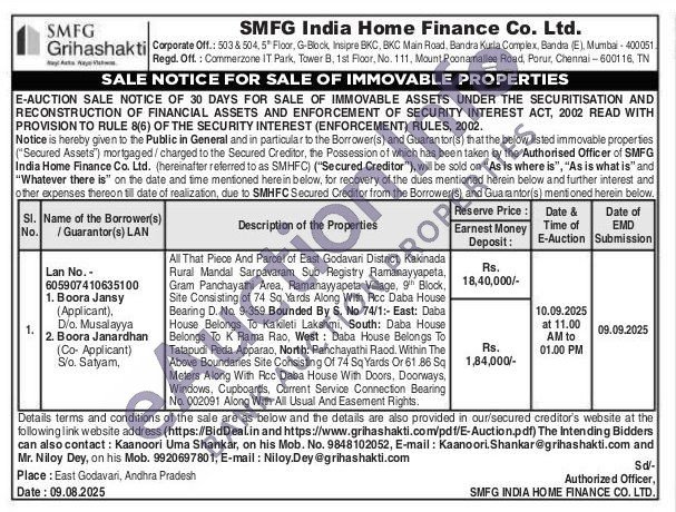 All That Piece And Parcel of East Godavari District, Kakinada Rural Mandal Sarpavaram Sub Registry Ramanayyapeta, Gram Panchayathi Area, Ramanayyapeta Village, gin Block, Site Consisting of 74 Sq Yards Along With Rcc Daba House Bearing D. No. 9-359 Bounded By S. No 74/1:- East: Daba House Belongs To Kakileti Lakshmi, South: Daba House Belongs To K Rama Rao, West: Daba House Belongs To Tatapudi Peda Apparao, North: Panchayathi Raod. Within The Above Boundaries Site Consisting Of 74 Sq Yards Or 61.86 Sq Meters Along With Rcc Daba House With Doors, Doorways, Windows, Cupboards, Current Service Connection Bearing No. 002091 Along With All Usual And Easement Rights.