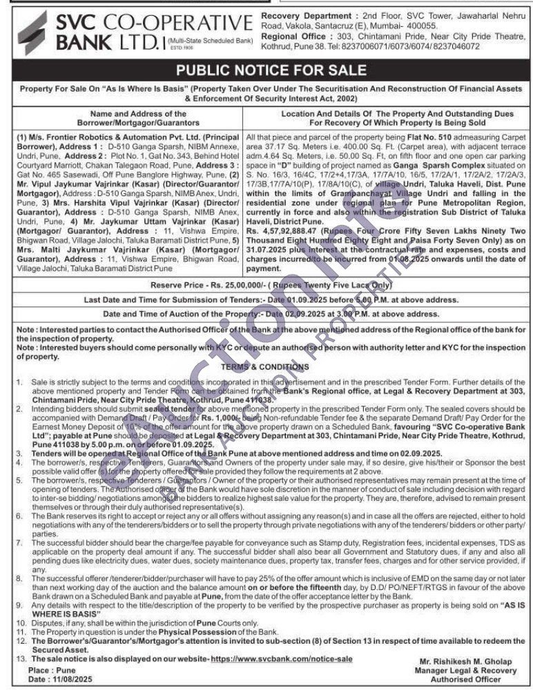 All that piece and parcel of the property being Flat No. 510 admeasuring Carp area 37.17 Sq. Meters i.e. 400.00 Sq. Ft. (Carpet area), with adjacent terra adm.4.64 Sq. Meters, i.e. 50.00 Sq. Ft, on fifth floor and one open car parkis space in "D" building of project named as Ganga Sparsh Complex situated S. No. 16/3, 16/4C, 17/2+4,17/3A, 17/7A/10, 16/5, 17/2A/1, 17/2A/2, 17/2A 17/38.17/7A/10(P), 17/8A/10(C), of village Undri, Taluka Haveli, Dist. Pum within the limits of Grampanchayat Village Undri and falling in th residential zone under regional plan for Pune Metropolitan Regia currently in force and also within the registration Sub District of Talulk.Haveli, District Pune
