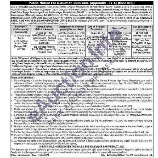 All that part and parcel of the property bearing Flat No A 903, 9th Floor, Stavan Avisha, Near Seema Hall, Prahaladnagar, Mouje Jodhpur, Ahmedabad, Gujarat 380015 (Area admeasuring:-1998 sq.ft)