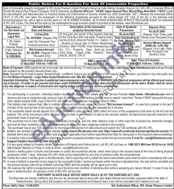 All that part and parcel of the property bearing Entire Third floor with roof rights. Property bear-ing No.22 & 23, Block & Pocket-H-1 Sector-11 situated at layout plan of Rohini Residential Scheme, Delhi-110085. Area Admeasuring (In Sq. FL): Property Type: Built Up Area, Land Area, Carpet Area Property Area: 446.00, 558.00, 379.10