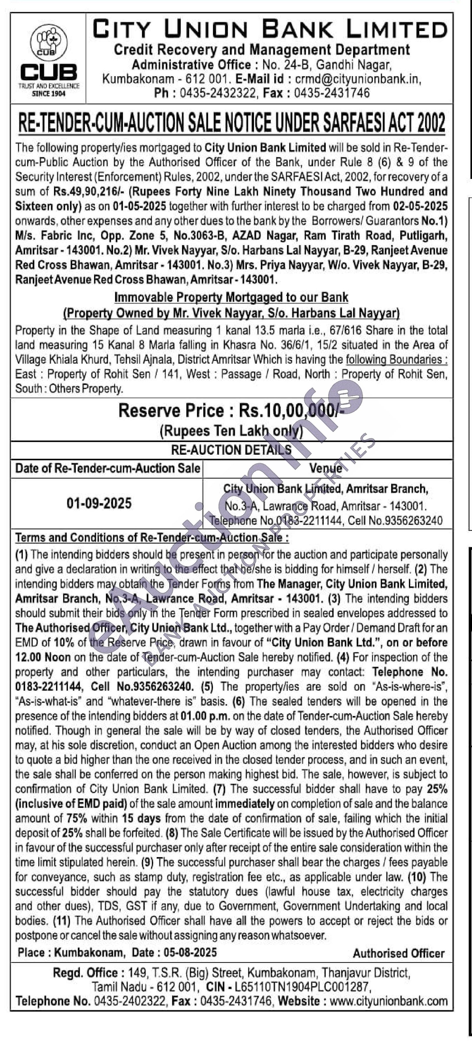 Property in the Shape of Land measuring 1 kanal 13.5 maria Le., 67/616 Share in the total land measuring 15 Kanal 8 Maria falling in Khasra No. 36/6/1, 15/2 situated in the Area of Villaga Khiala Khurd, Tehsil Ajnala, District Amritsar Which is having the following Boundaries: East: Property of Rohit Sen/141, West: Passage / Road, North Property of Rohit Sen, South: Others Property.