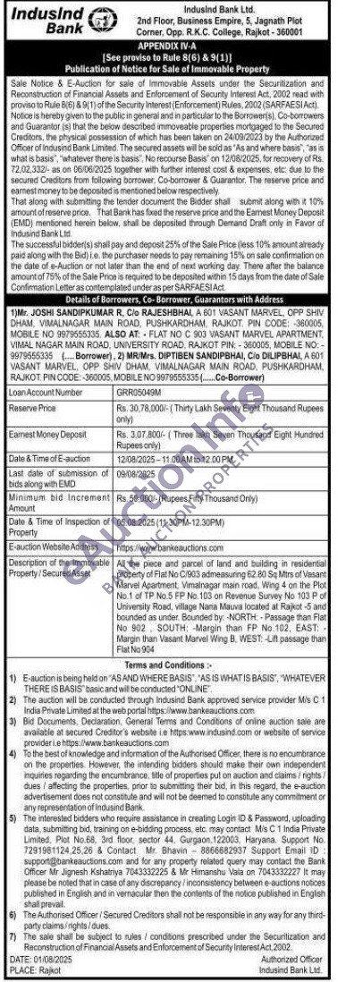 All the piece and parcel of land and building in residential property of Fiat No C/903 admeasuring 62.80 Sq Mirs of Vasant Marvel Apartment, Vimalnagar main road, Wing 4 on the Plot No.1 of TP No.5 FP No.103 on Revenue Survey No 103 P of University Road, village Nana Mauva located at Rajkot -5 and bounded as under. Bounded by: NORTH-Passage than Flat No 502 SOUTH. Margin than FP No. 102. EAST Margin than Vasant Marvel Wing B. WEST: Lift passage than Flat No 904