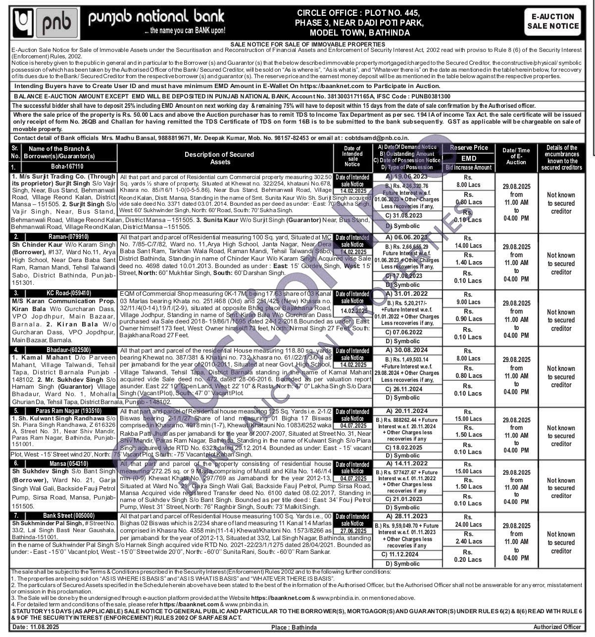 All that part and parcel of Residential house measuring 125 Sq. Yards i.e. 2-1/2 Biswas bearing 2-1/1/27 Share of land measuring 01 Bigha 17 Biswas comprised in Khasrano. 4918 min (1-7). Khewat/Khatauni No. 1083/6252 waka Rakba Patti Jhutti as per jamabandi for the year of 2007-2007, Situated at Street No. 31, Near Shiv Mandir, Paras Ram Nagar, Bathinda, Standing in the name of Kulwant Singh S/o Piara Singh acquired vide RTD No. 6323 dated 29.12.2014. Bounded as under: East-15' vacant Plot, West-15' Street wind 20', North: 75' Vacant Plot, South: -75' Vacantplot Kahan Singh.