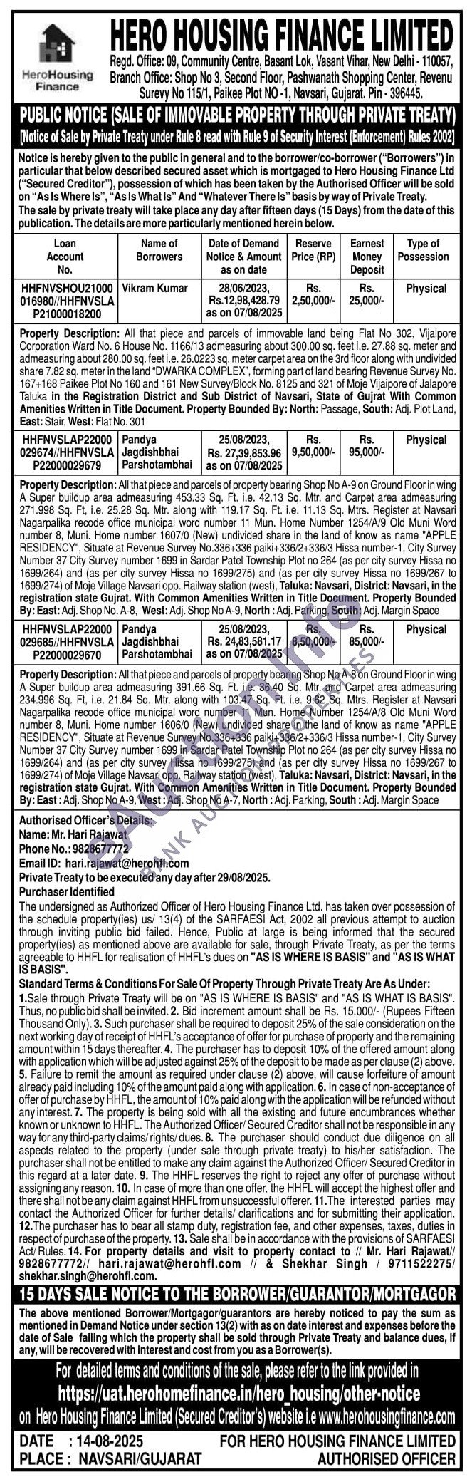 All that piece and parcels of immovable land being Flat No 302, Vijalpore Corporation Ward No. 6 House No. 1166/13 admeasuring about 300.00 sq. feet i.e. 27.88 sq. meter and admeasuring about 280.00 sq. feet i.e. 26.0223 sq. meter carpet area on the 3rd floor along with undivided share 7.82 sq. meter in the land "DWARKA COMPLEX", forming part of land bearing Revenue Survey No. 167+168 Paikee Plot No 160 and 161 New Survey/Block No. 8125 and 321 of Moje Vijaipore of Jalapore Taluka in the Registration District and Sub District of Navsari, State of Gujrat With Common Amenities Written in Title Document. Property Bounded By: North: Passage, South: Adj. Plot Land, East: Stair, West: Flat No. 301