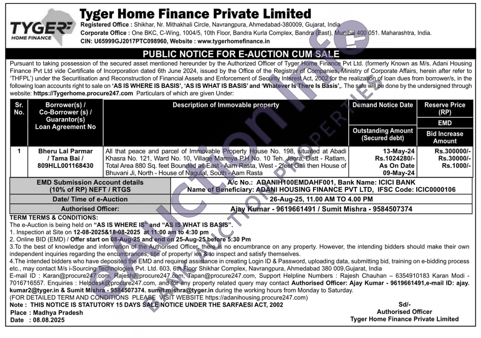 All that peace and parcel of Immovable Property House No. 198, situated at Abadi Khasra No. 121, Ward No. 10, Village Marmya P.H No. 10 Teh. Jaora, Distt - Ratlam, Total Area 880 Sq. feet Bounded as East - Aam Rasta, West - 2feet Gali then House of Bhuvani Ji, North - House of Nagulal, South - Aam Rasta