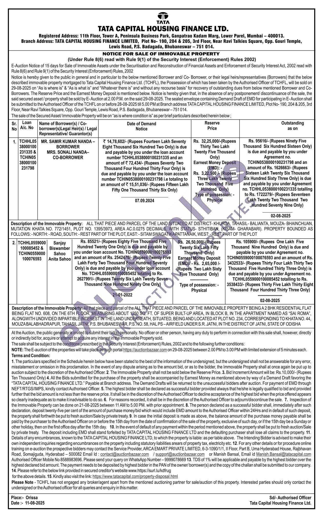 2) All that piece and parcel of the ALL THAT PIECE AND PARCEL OF THE IMMOVABLE PROPERTY BEING A 2 BHK RESIDENTIAL FLAT BEING FLAT NO. 608, ON THE 6TH FLOOR, MEASURING ABOUT 1250 SQ. FT. OF SUPER BUILT-UP AREA, IN BLOCK B, IN THE APARTMENT NAMED AS "SAI ROMA", ALONGWITH UNDIVIDED IMPARTIBLE INTEREST IN THE LAND UNDERNEATH, SITUATED, BEING AND LOCATED AT PLOT NO. 234, CORRESPONDING TO KHATANO. 44, MOUZA BALABHADRAPUR, TAHASIL JATNI, P.S. BHUBANESWAR, P.S. NO. 58, HAL PS-AIRFIELD UNDER S.R. JATNI, IN THE DISTRICT OF JATNI, STATE OF ODISHA
