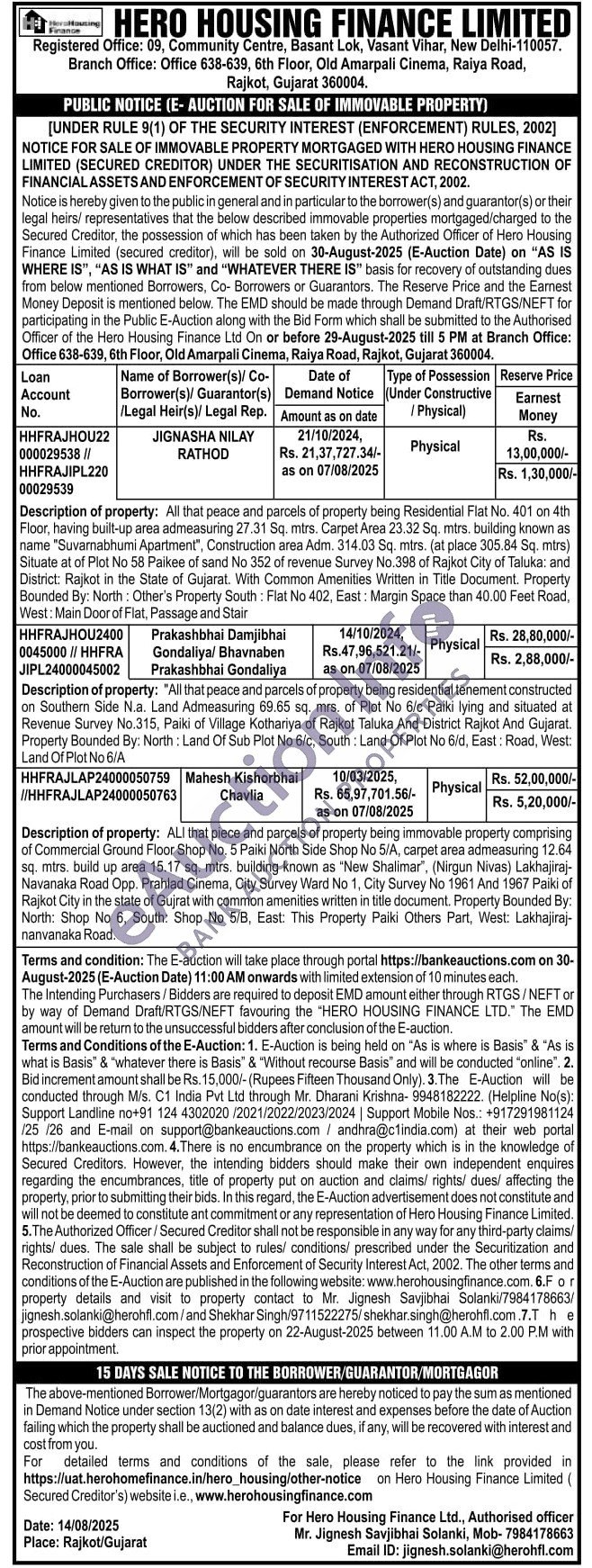 Description of property: All that peace and parcels of property being Residential Flat No. 401 on 4th Floor, having built-up area admeasuring 27.31 Sq. mtrs. Carpet Area 23.32 Sq. mtrs. building known as name "Suvarnabhumi Apartment", Construction area Adm. 314.03 Sq. mtrs. (at place 305.84 Sq. mtrs) Situate at of Plot No 58 Paikee of sand No 352 of revenue Survey No.398 of Rajkot City of Taluka: and District: Rajkot in the State of Gujarat. With Common Amenities Written in Title Document. Property Bounded By: North: Other's Property South: Flat No 402, East: Margin Space than 40.00 Feet Road, West: Main Door of Flat, Passage and Stair