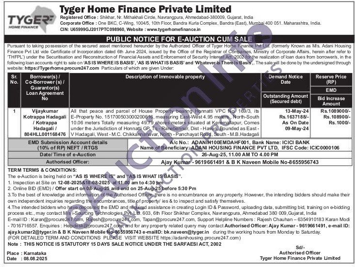 All that peace and parcel of House Property bearing Honnatti VPC No. 169/3, its E-Property No. 151700503000200616, measuring East-West 4.95 meters, North-South 10.06 meters Totally measuring 49.79 chores meters situated at Keremallapur, Comes under the Jurisdiction of Honnalti GP, Tq-Ranebennur, Dist-Haveri, Bounded as East-V Hadagali, West-M.C. Chikkannanavar, North-Panchayat Road, South-M.B.Hadagali